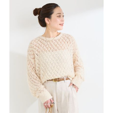 変形メッシュ編みによるさりげない立体感がシンプルのなかに洗練された印象を演出します。キャッチーな編み柄ながらクルーネックで着やすく、ロンTEEやシャツとのレイヤードや、暖かくなったら一枚着でも活躍します。