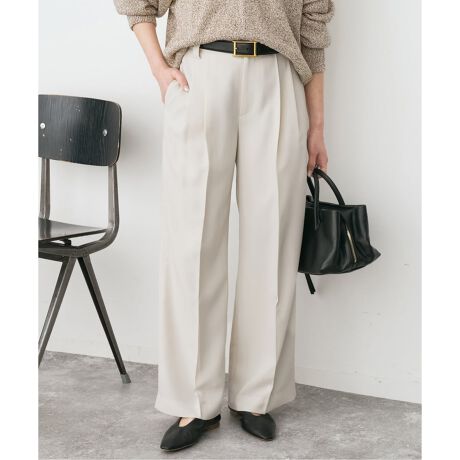 程よい光沢と落ち感のある素材を使用し、上品で洗練された印象に仕上げたタックワイドパンツ。フロントに施した2タックが腰まわりにゆとりを持たせつつ、太めのストレートシルエットが縦のラインを強調し、すっきりとしたバランスを演出します。