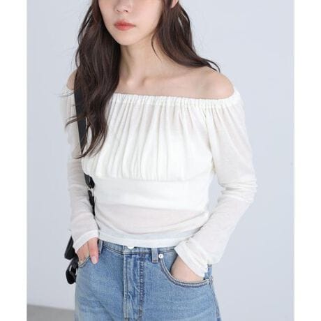 シアー感とメランジ調のあるカットソー生地を使用したトップス。襟ぐりから肩にゴムを入れており、オフショルとして着られます。バスト切り替え上にはギャザーでボリューム感を出し、切り替え下はタイトにしてウエストをすっきり見せるシルエットに。中にカラーや柄のキャミソールを合わせたり、長袖レースインナーとのレイヤードも楽しめます。※モデルの着用画像の場合、光の当たり具合により、実際の色味と異なって見えることがございます。色味は、商品単体の画像をご参照ください。