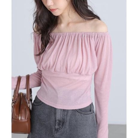 シアー感とメランジ調のあるカットソー生地を使用したトップス。襟ぐりから肩にゴムを入れており、オフショルとして着られます。バスト切り替え上にはギャザーでボリューム感を出し、切り替え下はタイトにしてウエストをすっきり見せるシルエットに。中にカラーや柄のキャミソールを合わせたり、長袖レースインナーとのレイヤードも楽しめます。※モデルの着用画像の場合、光の当たり具合により、実際の色味と異なって見えることがございます。色味は、商品単体の画像をご参照ください。