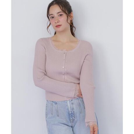 繊細なレースが襟ぐり、前立て、袖口にトリミングされたフェミニンなニット。デコルテがきれいに見える開き具合にこだわりました。すっきりとした糸を使用し、ほどよく体にフィットする美シルエットニットです。※撮影時照明の関係により、色味が違って見える場合がございます。またパソコン・スマートフォンなどの環境により、若干製品と画像のカラーが異なる場合もございます。予めご了承ください。商品の色味は、商品単品画像をご参照下さい。※商品画像はサンプルのため、色味やサイズ等の仕様に変更がある場合がございますので、予めご了承ください。