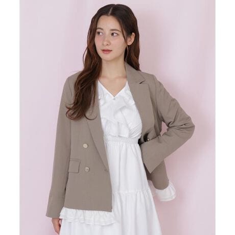 ドライタッチでしわになりにくくい素地を使用。ミニスカート(品番1256120030)とセットアップ着用可能。トレンドの白フリルが裾から出ているデザイン。フリルは取り外し可能なので、ノーマルなデザインのジャケットとしても使用できます。金ボタンがポイント。ミニ以外にもデニムパンツ合わせがおすすめ。※撮影時照明の関係により、色味が違って見える場合がございます。またパソコン・スマートフォンなどの環境により、若干製品と画像のカラーが異なる場合もございます。予めご了承ください。商品の色味は、商品単品画像をご参照下さい。※商品画像はサンプルのため、色味やサイズ等の仕様に変更がある場合がございますので、予めご了承ください。