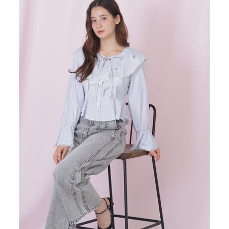 ストライプの薄手のシャツ地を使用した清涼感のあるブラウス。この時期から初夏まで長い期間着れる素材感。ラッフルと袖口の端についた繊細なレースが今年らしいポイント。デニムやキレイ目パンツとも相性抜群。袖口にゴムが入っているのでパフらせて着用がおすすめ。ジャケットの中に着て袖口をチラ見せさせるのもトレンド感があって◎※撮影時照明の関係により、色味が違って見える場合がございます。またパソコン・スマートフォンなどの環境により、若干製品と画像のカラーが異なる場合もございます。予めご了承ください。商品の色味は、商品単品画像をご参照下さい。※商品画像はサンプルのため、色味やサイズ等の仕様に変更がある場合がございますので、予めご了承ください。