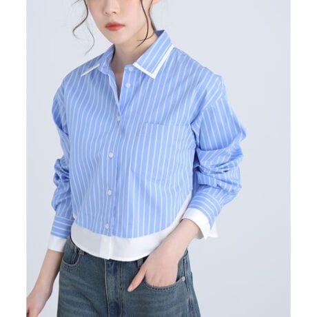 一枚で計算された重ね着スタイルが完成する主役級シャツ。ストライプ柄と白ポプリン生地をドッキングした遊び心のあるデザインです。襟元と裾から覗くホワイト生地が、顔まわりを明るく見せつつ、全体のシルエットに奥行きをプラス。ワイドカフスが手元に女性らしいニュアンスとトレンド感を出し、クロップド丈と裾のカーブでスタイルアップ効果も抜群です。羽織りにもトップスにも使えます。グレーやライトブルーのワイドデニム、カーゴパンツとのコーディネートがおすすめです。※モデルの着用画像の場合、光の当たり具合により、実際の色味と異なって見えることがございます。色味は、商品単体の画像をご参照ください。