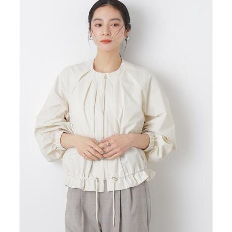 スポーティーな表情のあるナイロンタフタ素材を使用したノーカラーブルゾン。フロントは金属ジップの一枚仕立てで、軽く羽織れるライトブルゾンに仕上げた一着です。