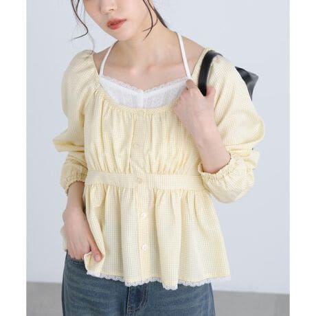 トレンドのレイヤードデザインが特徴のペプラムブラウス。表地はトレンドのギンガムチェックの布帛生地を使用、胸元はアイレット柄カットソー生地の異素材ドッキングで、レイヤード風のおしゃれが完成します。後ろリボンにトレンド大注目のホルターネック、胸元と裾のレースを付けたりと細かいディテールが可愛い一枚。袖口はゴムでフィット。ウエストを絞ったフレアシルエットなので、ミニスカートやフレアデニムとのコーディネートがおすすめです。※モデルの着用画像の場合、光の当たり具合により、実際の色味と異なって見えることがございます。色味は、商品単体の画像をご参照ください。