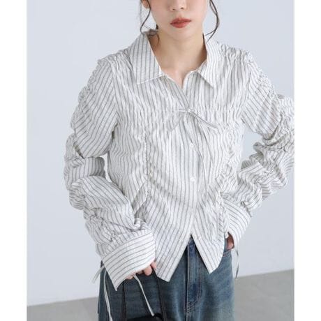 昨年ご好評いただいたシャツが今年も登場!今年は異ピッチストライプ3色に加え、トレンドのドット柄を揃えています。縦横シャーリングデザインで表情ゆたかに仕上げたシャツ。風合いのあるシャツ素材を使用しています。袖口カフスに共地リボンを通したドロストデザインがポイント。リボンの絞り具合いでサイズ調整も可能です。デニムやナロースカート、トレンドのハーフパンツとのスタイリングがおススメです。※モデルの着用画像の場合、光の当たり具合により、実際の色味と異なって見えることがございます。色味は、商品単体の画像をご参照ください。