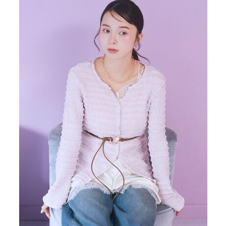 表情豊かなシャーリングで、やさしく華やぐ一枚全体に施したシャーリングが、自然な立体感とやわらかな表情を生み出します。伸縮性があるため身体の動きにやさしくフィットし、長時間の着用でも窮屈さを感じにくいのが魅力です。軽やかな素材感で、季節の変わり目にも取り入れやすく、重ね着にも活躍します。前を留めてトップス感覚で着たり、さっと羽織って温度調節に使ったりと着回し力も十分です。デニムやスカート、ワンピースとも相性がよく、毎日のコーディネートを大人可愛く仕上げてくれます。シンプルながらも表情のあるデザインなので、普段使いからお出かけまで幅広いシーンで頼れる一枚です。透け感[なし]