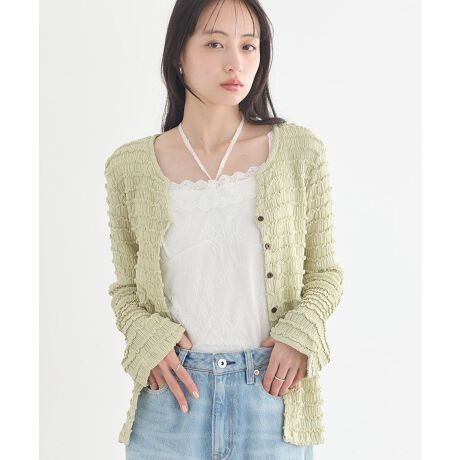 表情豊かなシャーリングで、やさしく華やぐ一枚全体に施したシャーリングが、自然な立体感とやわらかな表情を生み出します。伸縮性があるため身体の動きにやさしくフィットし、長時間の着用でも窮屈さを感じにくいのが魅力です。軽やかな素材感で、季節の変わり目にも取り入れやすく、重ね着にも活躍します。前を留めてトップス感覚で着たり、さっと羽織って温度調節に使ったりと着回し力も十分です。デニムやスカート、ワンピースとも相性がよく、毎日のコーディネートを大人可愛く仕上げてくれます。シンプルながらも表情のあるデザインなので、普段使いからお出かけまで幅広いシーンで頼れる一枚です。透け感[なし]