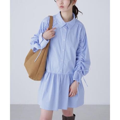 ペプラムシルエットが印象的なシャツブラウス。袖にシャーリングとリボンを施しボリューム感と甘さをプラス。肩ヨークにはギャザーが入り、立体感のあるシルエットを引き立てます。ハンサムなシャツカラーとフェミニンなディテールの組み合わせが魅力。シンプルなパンツやデニム合わせで大人カジュアルに、ショートパンツ合わせでミニワンピース風にも着られます。ローファーやバレエシューズ合わせで抜け感を出すと、トレンド感がアップするコーディネートが楽しめます。無地オフカラーとサックスストライプ柄のアソート展開です。※モデルの着用画像の場合、光の当たり具合により、実際の色味と異なって見えることがございます。色味は、商品単体の画像をご参照ください。