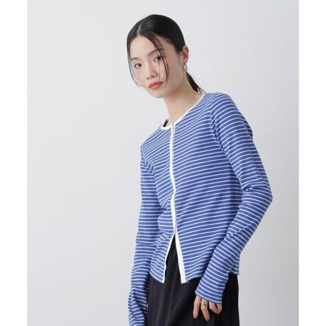 細ピッチのボーダーと、多めのボタンが特徴の前後2wayリブトップス。クルーネック・ボタン開きの2wayで違う雰囲気のデザインを楽しめて、コーディネートの幅が広がるアイテムです。