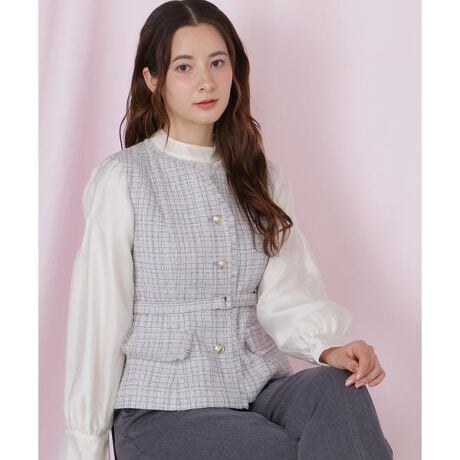上品にキラキラと光るツィード素材を使用したジレ。共地のベルト付きでウエストマーク。襟ぐりとアームホールのフリンジがポイント。袖シアーフレアニットをインナーに合わせ、チュール等のボリュームスカート又はデニム合わせや、キレイ目パンツ合わせでオフィスにもおすすめ。※撮影時照明の関係により、色味が違って見える場合がございます。またパソコン・スマートフォンなどの環境により、若干製品と画像のカラーが異なる場合もございます。予めご了承ください。商品の色味は、商品単品画像をご参照下さい。※商品画像はサンプルのため、色味やサイズ等の仕様に変更がある場合がございますので、予めご了承ください。