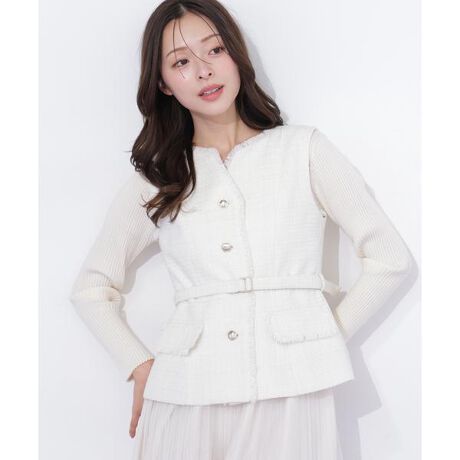 上品にキラキラと光るツィード素材を使用したジレ。共地のベルト付きでウエストマーク。襟ぐりとアームホールのフリンジがポイント。袖シアーフレアニットをインナーに合わせ、チュール等のボリュームスカート又はデニム合わせや、キレイ目パンツ合わせでオフィスにもおすすめ。※撮影時照明の関係により、色味が違って見える場合がございます。またパソコン・スマートフォンなどの環境により、若干製品と画像のカラーが異なる場合もございます。予めご了承ください。商品の色味は、商品単品画像をご参照下さい。※商品画像はサンプルのため、色味やサイズ等の仕様に変更がある場合がございますので、予めご了承ください。