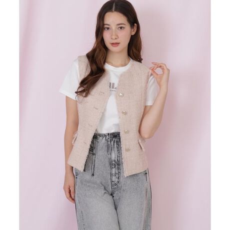 上品にキラキラと光るツィード素材を使用したジレ。共地のベルト付きでウエストマーク。襟ぐりとアームホールのフリンジがポイント。袖シアーフレアニットをインナーに合わせ、チュール等のボリュームスカート又はデニム合わせや、キレイ目パンツ合わせでオフィスにもおすすめ。※撮影時照明の関係により、色味が違って見える場合がございます。またパソコン・スマートフォンなどの環境により、若干製品と画像のカラーが異なる場合もございます。予めご了承ください。商品の色味は、商品単品画像をご参照下さい。※商品画像はサンプルのため、色味やサイズ等の仕様に変更がある場合がございますので、予めご了承ください。