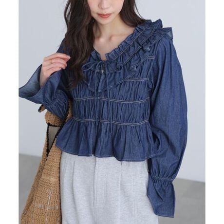 前後で着られる2way仕様のフリルブラウス。リボン開きとシンプルな表情の両方が楽しめ、気分やスタイリングに合わせて着回せます。襟まわりの立体的なWフリルが映え、身頃シャーリングで程よくフィットするペプラムシルエットを演出します。デニムやスラックスはもちろん、スカートとのコーディネートもおすすめ。それぞれ異なる雰囲気を楽しめるアソート素材展開です。ベージュ無地はワッシャー感のある表情。ドット柄は軽やかなシボ表情がポイント。ライトオンスデニムを使用したワンウォッシュは、配色ステッチがさりげないアクセントになっています。※モデルの着用画像の場合、光の当たり具合により、実際の色味と異なって見えることがございます。色味は、商品単体の画像をご参照ください。
