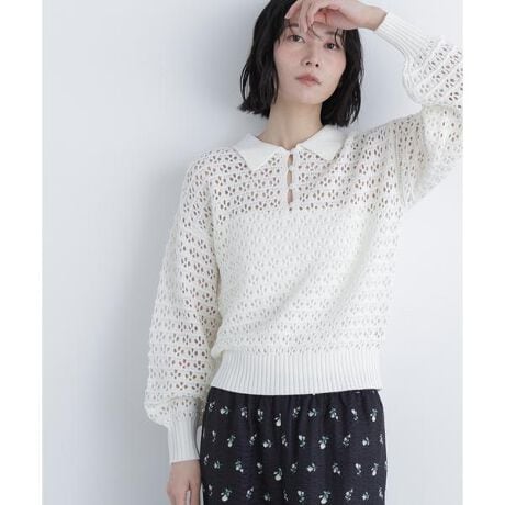 トレンドの襟ディテールと春らしいオリジナルの透かし編み柄を組み合わせたポロニット。肩の位置を落とし、袖口にボリュームをもたせたカジュアルなデザインです。フロントのころんとしたクルミ釦がポイント。大きすぎないシルエットなのでボリュームのあるパンツやスカート合わせもおすすめです。<素材>ブランドオリジナルの透かし編み柄を春らしい綿混素材で編み立てています。<詳細>仕様・前ボタン裏地・なし透け感・あり / 光沢・なし / 伸縮性・あり生地の厚さ・普通※モデルの着用画像の場合、光の当たり具合により、実際の色味と異なって見えることがございます。色味は、商品単体の画像をご参照ください。