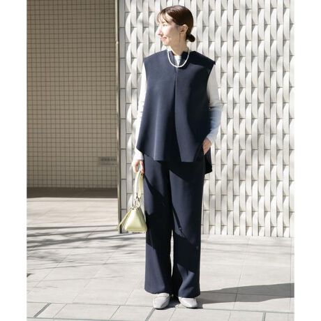 適度な厚みとハリを持つボンディング素材を使用し、体のラインを拾わない立体的なシルエットを叶えたベストセットアップ。反発力のある素材感が、360度どこから見ても美しいフォルムをキープします。微光沢のある上品な表情で、オフィスやきれいめなお出かけなど幅広いシーンに対応。シャープなキーネックのベストは、前後差のある着丈とサイドスリットでヒップラインをさりげなくカバーし、ストレートパンツが脚をすっきり演出。インナー付きで、すぐに洗練されたスタイルが完成する一着です。