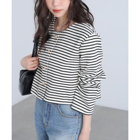 打ち込みの良い厚手のカットソーを使用した、軽くて動きやすいノーカラージャケット。金色ボタンをアクセントにカジュアルに着られるデザインです。ボタンを閉めてハイネックと合わせたり、前を開けてカーディガン感覚でも羽織れます。短め丈なのでロングワンピースともバランス良く着られます。※モデルの着用画像の場合、光の当たり具合により、実際の色味と異なって見えることがございます。色味は、商品単体の画像をご参照ください。