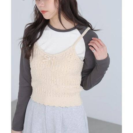 [型番:1316170217]カジュアルでヴィンテージ感ある毛足糸を使用した透かし編みビスチェ。表情のある糸にコットンアクリルを引き揃え、程よくしっかりとした編地に仕上げています。コンパクトなシルエットのキャミソール型で、フロントリボンと裾スカラップがポイント。無地やラグラン、ボーダーなど、コンパクトTシャツとのレイヤードがおすすめです。※モデルの着用画像の場合、光の当たり具合により、実際の色味と異なって見えることがございます。色味は、商品単体の画像をご参照ください。