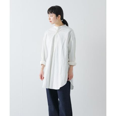 程よいハリとコットン100%の優しい肌触りが心地よい素材感。やや長めのカフスが特徴的で、後ろヨーク下にほんのりとギャザーが入っています。ヒップまわりをカバーするラウンドヘムがパンツとのバランスを取りやすいデザインに仕上がっています。上からベストを重ねても決まり様々な着こなしが叶う一品です。