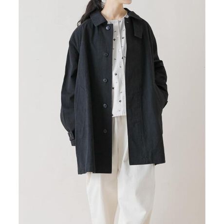 いつもの装いにこなれ感をプラスするスタンドカラーのコート。遠州染めの風合い豊かな生地は、ごわつかず程よいハリが品のある印象に。よく見ると単調な色味ではない独特な染め具合です。ラグラン袖が着やすく、身幅はワイドですが大きく見えすぎないパターンを採用しています。後ろにはタックが入りさり気なく広がるシルエット。ボタンは一番上だけ見える仕様。第二ボタンから下は比翼仕立てになっていてミニマルな雰囲気です。襟を立ててチンストラップを留めるとマニッシュなムードに。シンプルすぎない絶妙な加減が大人の着こなしに差をつける1枚に仕上がっています。寒さ残る時期にはニットを、春先にはブラウスやカットソーを合わせてお楽しみください。同素材のシリーズアイテムもぜひご覧ください。