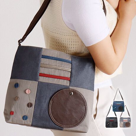 ・ナイロンとデニムのパッチワークにサークルとボーダーのモチーフがアクセントに!
