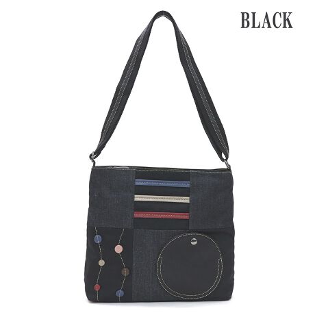 ・ナイロンとデニムのパッチワークにサークルとボーダーのモチーフがアクセントに!