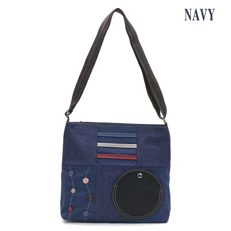 ・ナイロンとデニムのパッチワークにサークルとボーダーのモチーフがアクセントに!