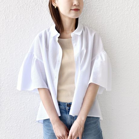 涼しげなサッカー素材にボリューム感のある袖が女性らしいギャザーシャツ
