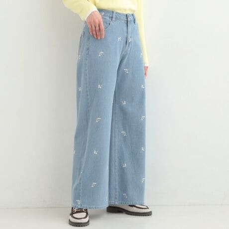 小さな白いお花の刺繍がアクセントになった、トレンド感のあるバギーシルエットのデニムパンツ。