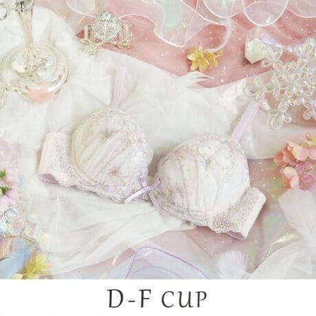 物語に登場する妖精「ティンカーベル」をモチーフにしたシリーズです。レースにはくるくると曲線を描く羽や、小花の刺繍を様々なステッチで散りばめて、ティンカーベルが軽やかに舞う様子を表現。色とりどりのオーロラ糸やマルチ糸を織り交ぜることで、妖精の光の粒子が放つ、夢のような輝きを演出します。サイドにはお揃いのアップリケをあしらい、細部まで華やかな印象に。光の角度によって表情を変える繊細なきらめきが、身に着けるだけでときめきの魔法をかける、ロマンティックなコレクションです。
