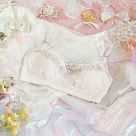 物語に登場する妖精「ティンカーベル」をモチーフにしたシリーズです。レースにはくるくると曲線を描く羽や、小花の刺繍を様々なステッチで散りばめて、ティンカーベルが軽やかに舞う様子を表現。色とりどりのオーロラ糸やマルチ糸を織り交ぜることで、妖精の光の粒子が放つ、夢のような輝きを演出します。リボンにはお揃いのアップリケをあしらい、細部まで華やかな印象に。光の角度によって表情を変える繊細なきらめきが、身に着けるだけでときめきの魔法をかける、ロマンティックなコレクションです。