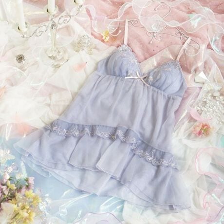 物語に登場する妖精「ティンカーベル」をモチーフにしたシリーズです。レースにはくるくると曲線を描く羽や、小花の刺繍を様々なステッチで散りばめて、ティンカーベルが軽やかに舞う様子を表現。色とりどりのオーロラ糸やマルチ糸を織り交ぜることで、妖精の光の粒子が放つ、夢のような輝きを演出します。身生地は透け感を楽しめる2枚重ねのチュール素材に。中央の切り替えと前後で丈感を変えるデザインで、妖精のドレスのようなフレアシルエットが完成しました。バックスタイルには羽のようにラウンドカットしたチュールと小花のアップリケをあしらい、細部まで華やかな印象に。光の角度によって表情を変える繊細なきらめきが、身に着けるだけでときめきの魔法をかける、ロマンティックなコレクションです。