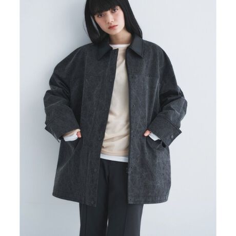 襟やポケット口に施された合成皮革が、洗練されたモード感を演出。