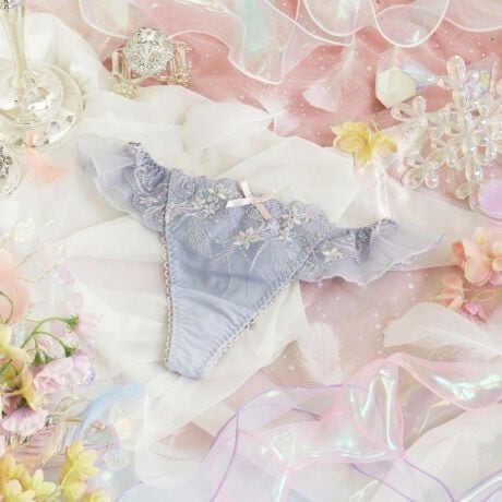 物語に登場する妖精「ティンカーベル」をモチーフにしたシリーズです。レースにはくるくると曲線を描く羽や、小花の刺繍を様々なステッチで散りばめて、ティンカーベルが軽やかに舞う様子を表現。色とりどりのオーロラ糸やマルチ糸を織り交ぜることで、妖精の光の粒子が放つ、夢のような輝きを演出します。バックスタイルのお揃いのアップリケと、透け感のあるチュール素材で、甘く可愛らしい印象に。光の角度によって表情を変える繊細なきらめきが、身に着けるだけでときめきの魔法をかける、ロマンティックなコレクションです。