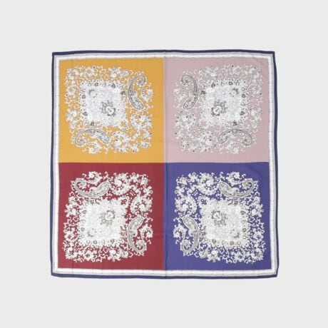 画像のように1枚の中を4分割で配色し、折り方・結び方で見える色が変わるマルチフェイス仕様です。
