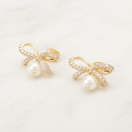 ビジューリボンにパール調が付いたデザインピアス。