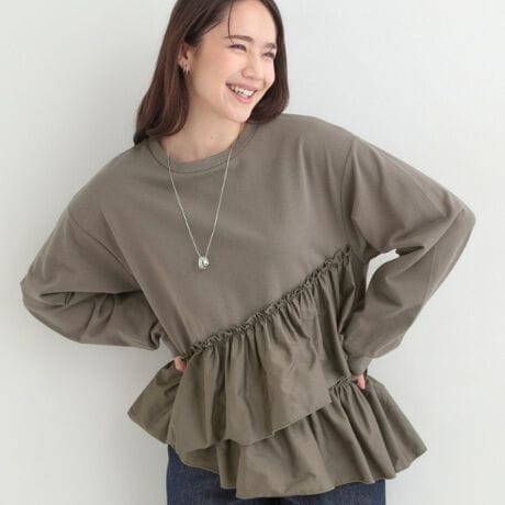 ベーシックな薄手のスウェットに、サイドからシャツ地のティアードフリルを施したトップス。