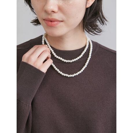パール調のボールネックレスに、キラリとアクセントになるカラビナ風のメタルリングをプラスしているのがポイントです。