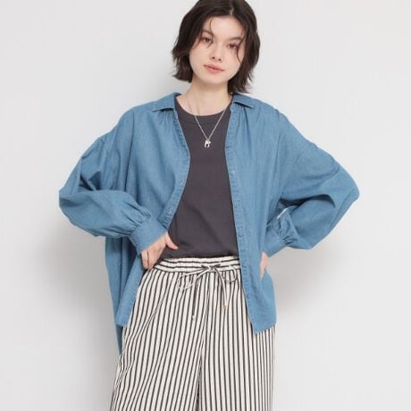 スキッパーデザインですっきりしたネック周りと背中のギャザーデザインの入ったシャツ。