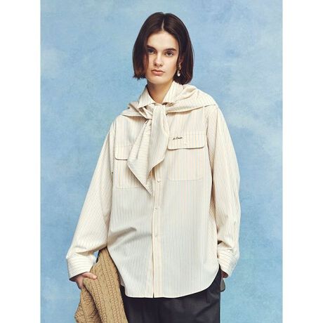 全色ストライプ柄のシャツ素材を使用し、同じ素材で作った三角スカーフがセットになっています。