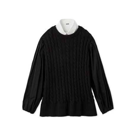 クリーンな印象のシャツに、味のあるケーブル編みのベストを重ね着しているように見えて、実は一枚のドッキングアイテム。