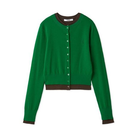 ブラウンのカーディガンをレイヤードした鮮やかなグリーン、ピンクのカーディガンをレイヤードした鮮やかなレッド、柔らかなブルーのカーディガンをレイヤードしたネイビーの3色展開です。
