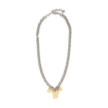 ランダムなメタルプレートが連なった、チェーンネックレスです。スクエアモチーフのチャームと、ラウンド型のチャームが並び、キラキラと揺れて煌めくデザイン。