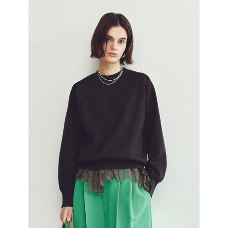 ニットのプルーオーバーとレースヘムのTシャツの2枚がセットになったアイテム。絶妙なバランスのレイヤードスタイルが、失敗なく作れます。