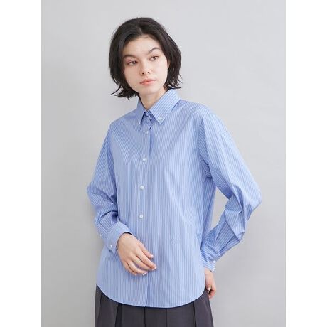 『Mila Owen』は、この生地でクラシカルなボタンダウンシャツをデザイン。身頃にややゆとりを持たせて、ボーイッシュな印象に仕上げました。