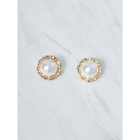 パールを囲む、花のようなメタルパーツは、味があってレトロなムード。適度なボリューム感があるので、華やかに装えるうえ、小顔効果も叶います。