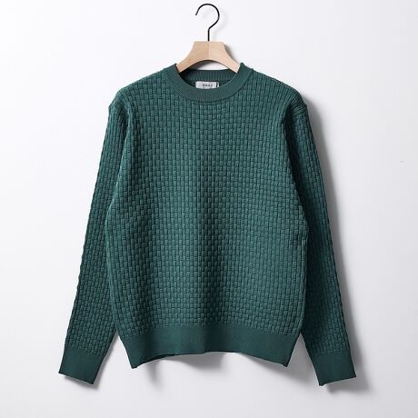 生地に凹凸あるジャガード編みで幾何学柄を表現したニットソー。 主張しすぎない無地見えの柄で安心感を与えます。 一枚でもジャケット、アウターのインナーとしても活躍するデザインです。ジャケットのインナーで使用すれば奥行きのあるジャガード編みがさりげなく主張します。