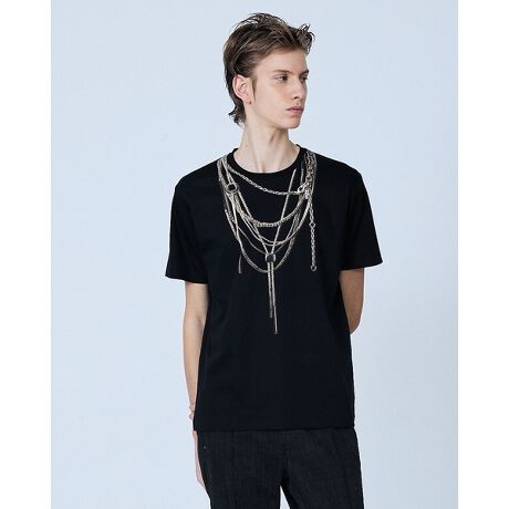 この企画に合わせて、ジュエリーブランド『YArKA( ヤーカ )とのセッションが実現。Tシャツの上からネックレスをレイヤースタイルした、トロンプルイユ(Trompe-l'?il【仏】だまし絵 ) を施したデザイン T シャツです。