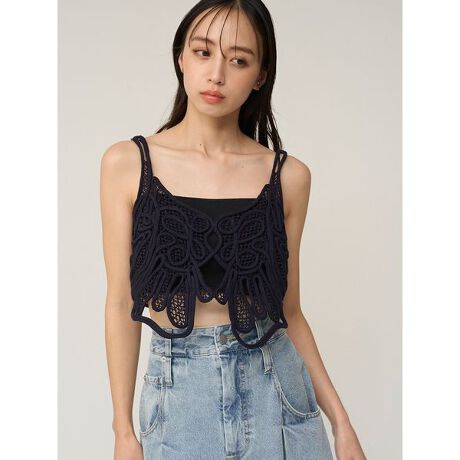 ニットコードを編み込んだレースのようなオリジナル模様がモード感のある、ロープビスチェが届きました。ロープ模様の中にメッシュを加え、着やすくデザインしています。背中側は2本の細リボンで愛らしさをプラス。肩紐ストラップはアジャスタ付きで長さ調節が可能です。アクセサリ感覚でスタイリングに取り入れやすくプラスワンで華やぐアイテムです。ボリューミーなロングデニムスカート(SWFS261247)合わせもおすすめです。